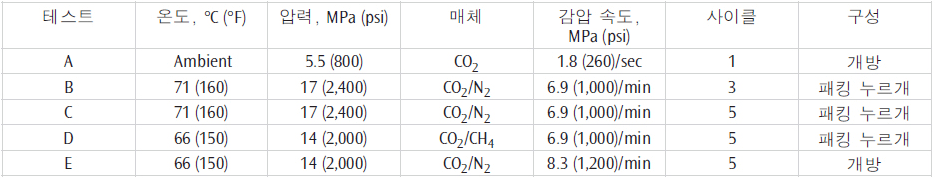 5 사이클, 상승된 압력 및 온도에서 48시간 유지. 모든 감압은 모두 1000psi/min 미만임. 전체고정물은 사이클 사이에 최소 1시간동안 주변 압력에서 견딤.