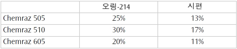아래 표에서 동일 조건 (70hr, 대기, 400°F / 204°C)일 때 세 가지 Chemraz 제품과 사이즈 AS214 오링 및 ASTM 395B 시편에 대한 영구 압축 변형률 측정값을 비교하였습니다. 특정 제품에 따라 대기중에서 측정한 영구 압축 변형률은 질소 중에서 측정한 값과 상당히 다를 수 있습니다. Chemraz 제품은 광범위한 환경에서 우수한 성능을 제공합니다.