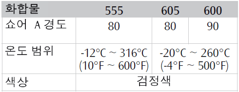 Chemraz 605와 600은 Chemraz 505와 같은 화학적 내성을 가졌을 뿐만 아니라 보다 높은 온도 범위를 제공하고 있습니다.