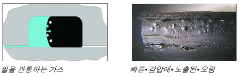 모든 탄성체는 약간의 투과성이 있습니다.일정 시간 동안 높은 가스 압력에 노출되었을 때 탄성체는 분자 사슬간 틈에 자리잡은 가스를 흡수합니다. 이 과정은 주변 시스템에서의 압력과 씰 내부의 압력이 동일해질 때까지 계속됩니다. 압력이 높을수록 더 많은 가스가 흡수됩니다. 시스템이 빠르게 감압된다면 탄성체 내 가스는 그 자신의 높은 압력 하에서 팽창하게 될 것입니다. 압력이 탄성체로부터 벗어날 수 있을 정도로 충분히세지 않거나 탄성체의 구조가 충분히 안정하지 않다면 기포나 균열이 형성되어 씰을 파괴하고 기능을 잃게 할 것입니다. 씰의 빠른 부피 증가는 또한 압출 현상을 일으킬 지도 모릅니다. 아래 사진은 고압 및 고온에서 천연 가스 추출시 빠른 감압에 노출된 오링을 나타냅니다. 갑작스럽고 빠른 압력 강하로 인해 야기된 파열과 발포를 볼 수 있습니다.