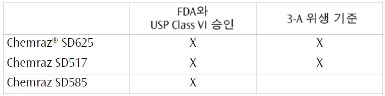 FDA는 연방 식품, 의약 및 화장품 조례(21 U.S.C 348(h)항)의 409(h)항에서 기술된 FNC 공정(식품 접촉 물질 공지)을 통해 식품 접촉 물질의 이용을 승인하고 있습니다. FCNs 000245와 000247발행물에서 FDA는 Chemraz 과불화 탄성 중합체인 SD625, SD517 및 SD585로 만들어진 품목들이 식품과 접촉시 반복 이용에 적합한 요구 사항을 준수한다고 승인하였습니다.