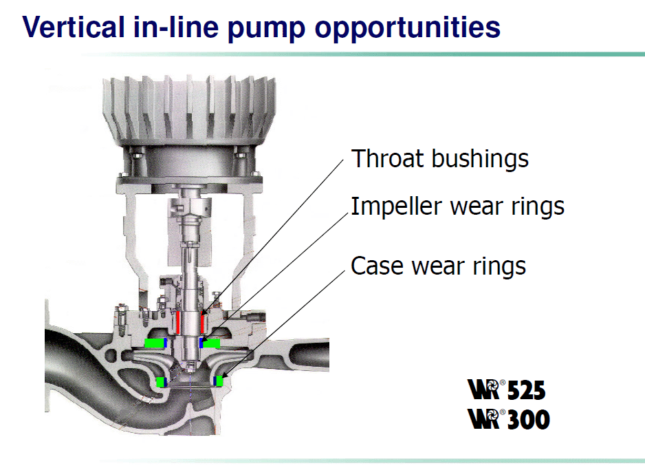 최근에 나온 API 610 사양 제 9판은 이용 가능한 개선 제품들을 공표하고 있는데, 그 중에는 그린 트위드의 WR 재료와 같은 중합체 기초 복합물질을 적절히 사용할 경우 펌프의 성능을 향상시킬 수 있는 금속 마모 물질 대체품으로 명기하고 있습니다.